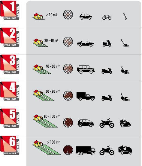 • Intenzita používání: důležité je, jak intenzivně budete myčku používat. Výrobce tlakových myček Lavorwash S.p.A. Italy dělí intenzitu používání do 6 úrovní. Na konci stránky je i piktogramové znázornění vhodnosti použití myčky s různou intenzitou zátěže.