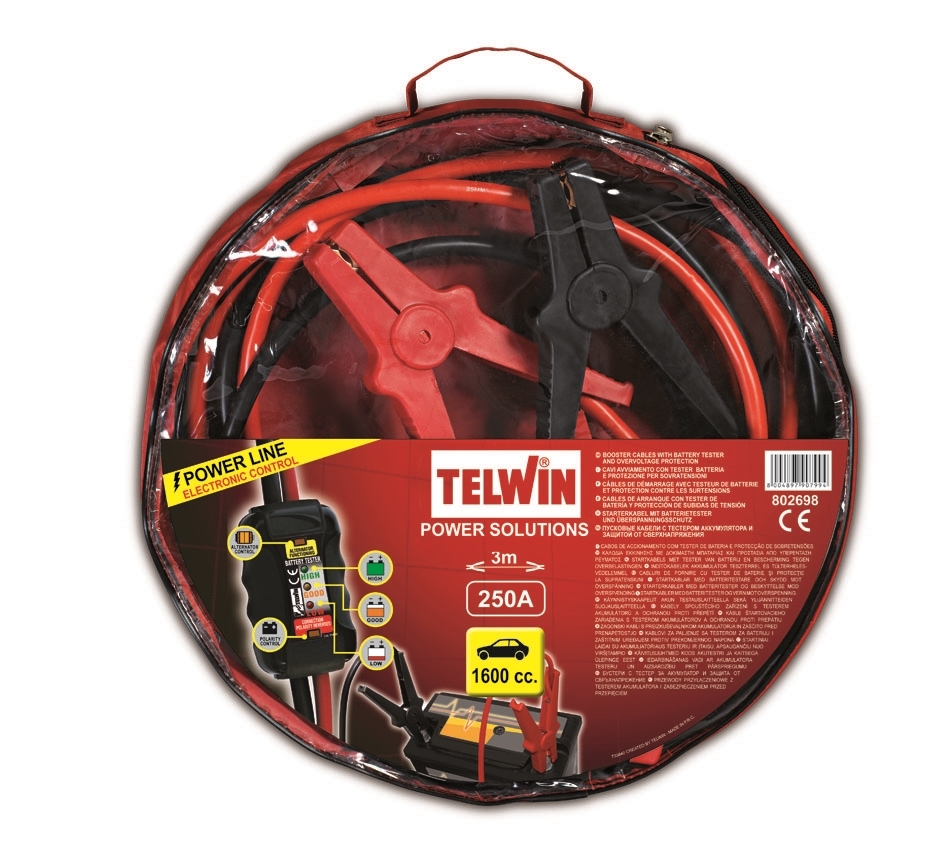 Startovací kabely 250 A Telwin pro nouzové nastartování, délka 3 m, s testerem baterie-indikace nabití 3 led diody.